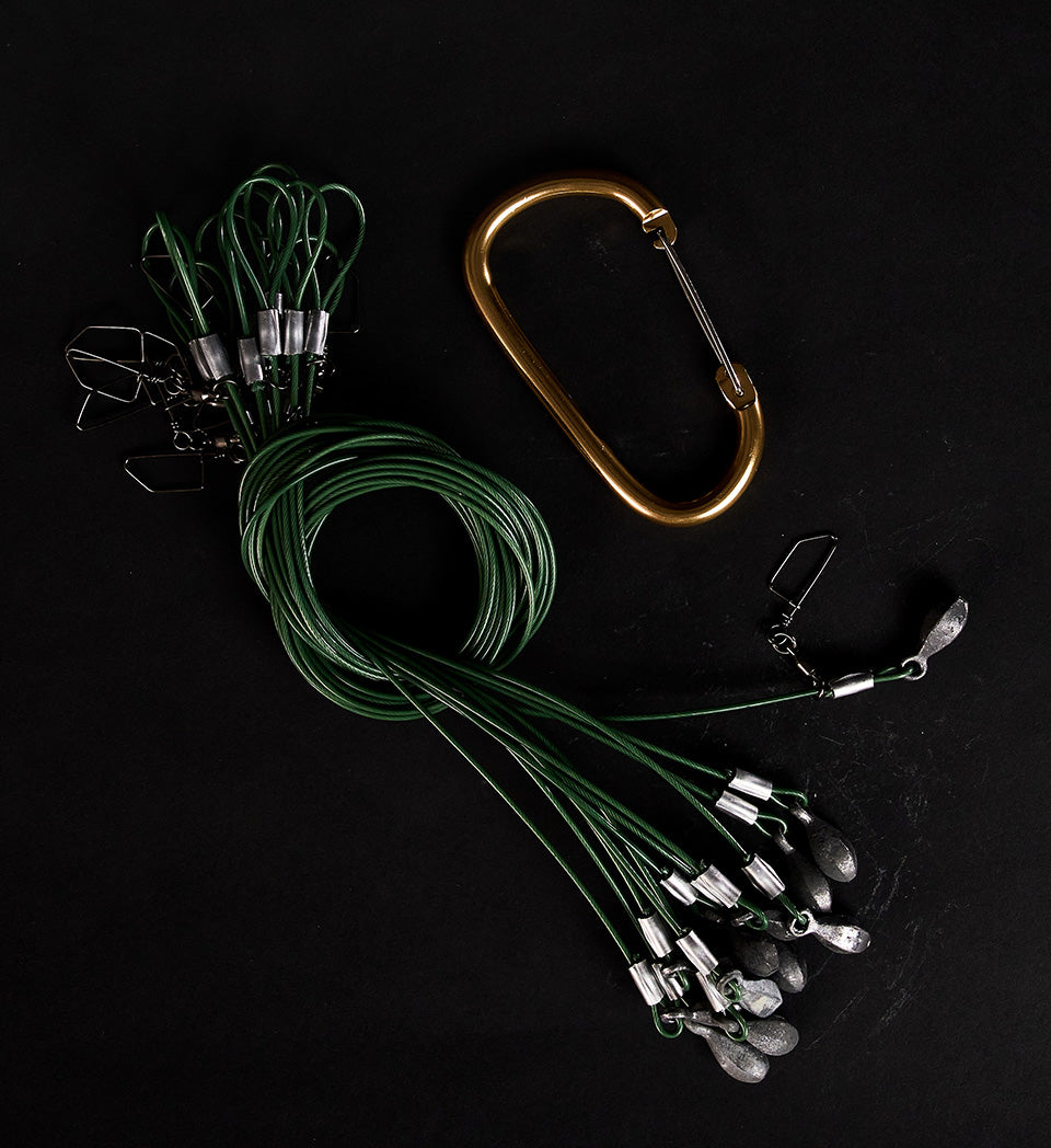 The 3’ 1oz teardrop weight configuration is designed for use in shallow water with almost no current and little wind. We designed this rig for the public land hunter that has a hike ahead of him. Ideal uses include flooded timber holes, or anywhere that is well off the beaten path. Includes 12 complete rigs, 1 HangAll Carabiner, and mesh bag.