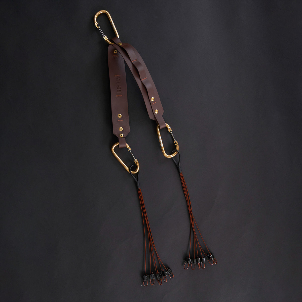 Minimalist bird strap. 2 Bare Tote - 6 Drops, HydroLeather Connection Strap, 3 HangSome Carabiners. 12 total drops - constructed using our original coated steel cable.